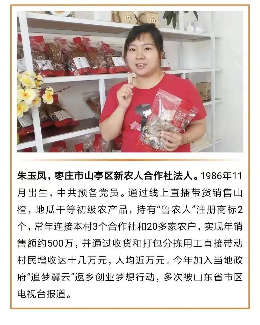 朱玉凤本是一名资深高级纹绣导师,在广东从事纹绣行业13年,奋斗多年收入很可观。2016年,朱玉凤与丈夫回老家——山东省枣庄市徐庄镇藤花峪村过年,看到村里路宽了,农业生产也逐步机械化,但农产品销售却一直都是问题。